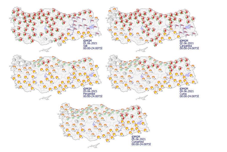 Meteoroloji Genel Müdürlüğü tarafından yapılan son değerlendirmelere göre; Ülkemizin kuzey, iç ve batı kesimlerinde görülecek sağanak ve gök gürültülü sağanak şeklindeki yağışların; Marmara’nın güneyi, İç Ege, Batı Akdeniz’in iç kesimleri, Tekirdağ, Kastamonu, Karabük, Sinop, Çankırı ile Ankara’nın kuzey ve batı kesimlerinde yerel olarak kuvvetli olması bekleniyor.