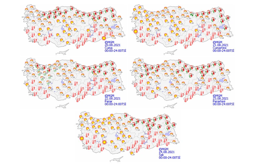 Meteoroloji Genel Müdürlüğünden alınan tahminlere göre, yurdun kuzey kesimlerinin parçalı ve yer yer çok bulutlu, Batı ve Doğu Karadeniz, Orta Karadeniz kıyıları, Doğu Anadolu'nun kuzeydoğusu ile Sakarya çevrelerinin yerel sağanak ve gök gürültülü sağanak yağışlı, diğer yerlerin az bulutlu ve açık geçeceği tahmin ediliyor.