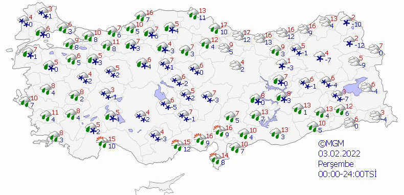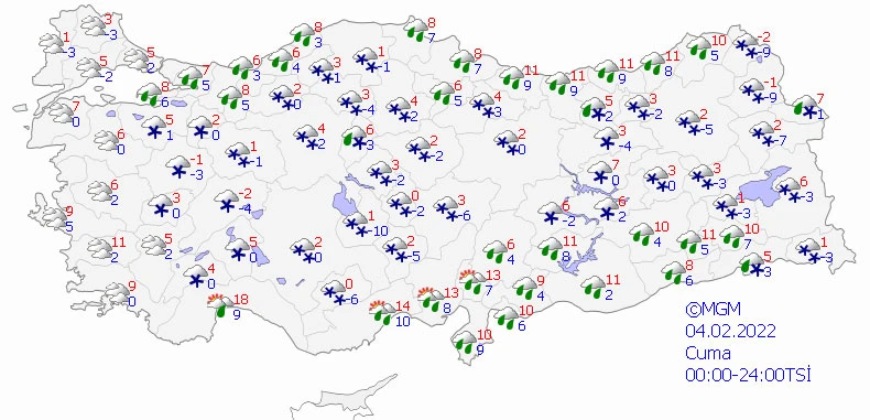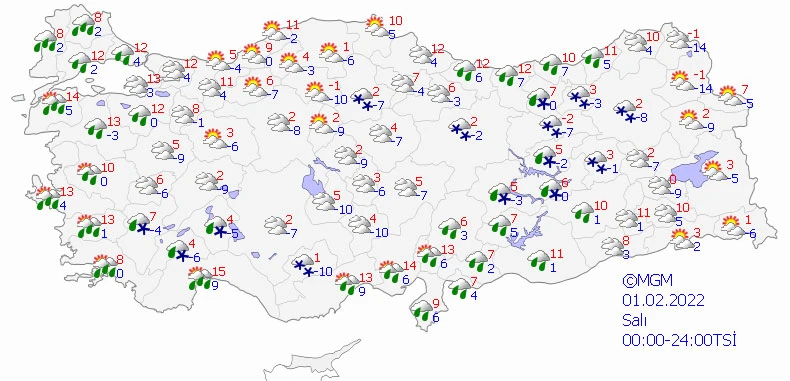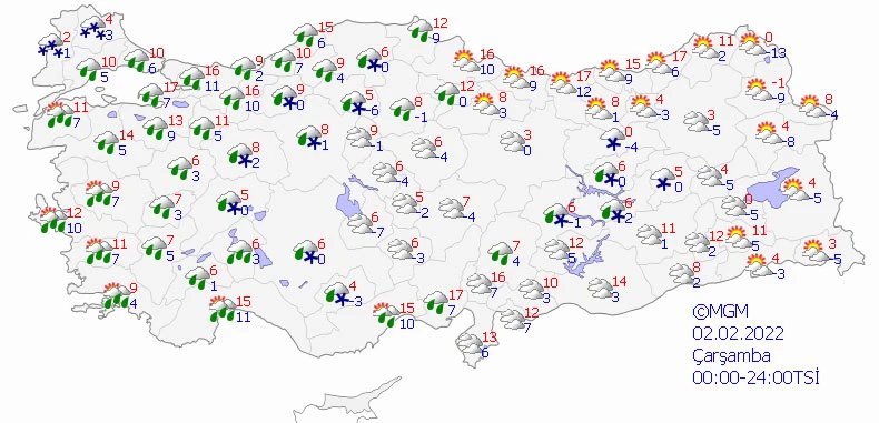 Parçalı ve çok bulutlu, kıyı kesimleri yağmurlu, iç kesimleri karla karışık yağmurlu, yüksekleri kar yağışlı