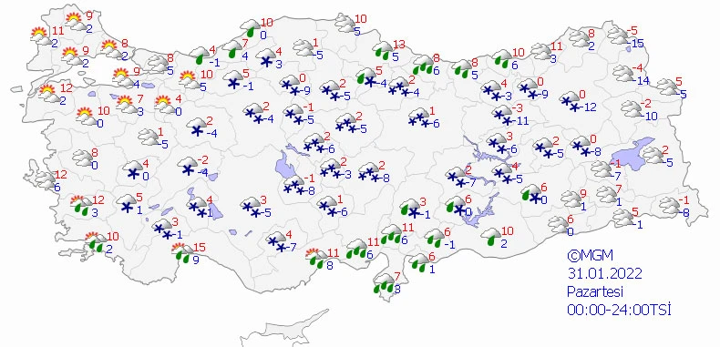 Meteoroloji Genel Müdürlüğü tarafından yapılan tahmine göre, 31 Ocak pazartesi günü sabahtan itibaren kar yağışının İç Anadolu’nun doğusu ile Orta Karadeniz’in iç kesimlerinde görülecek karın Aksaray, Nevşehir, Kırşehir, Kayseri, Sivas, Yozgat ve Tokat çevrelerinde kuvvetli (10-20 cm) ve yer yer yoğun (20 cm üzeri) olacağı belirtildi.