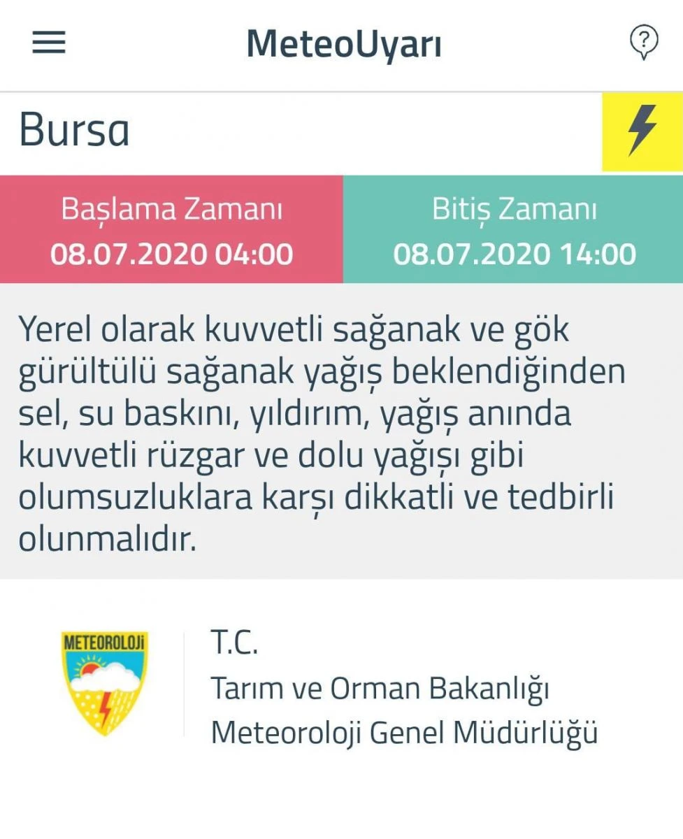 Meteoroloji Genel Müdürlüğünden yapılan açıklamada, "Yerel olarak kuvvetli sağanak ve gök gürültülü sağanak yağış beklendiğinden sel, su baskını, yıldırım, yağış anında kuvvetli rüzgar ve dolu gibi olumsuzluklara karşı dikkatli ve tedbirli olunmalıdır" denildi.