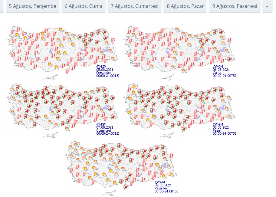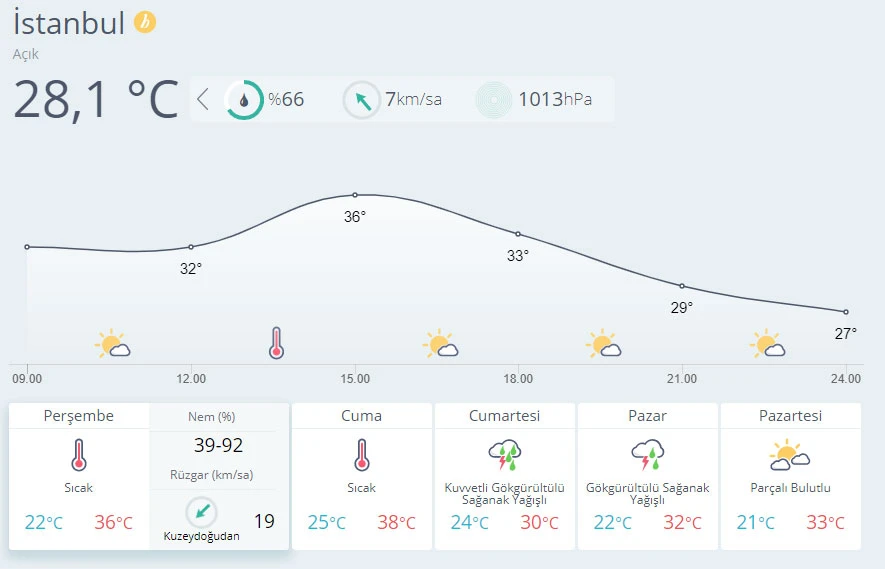 Meteoroloji Genel Müdürlüğü tarafından yapılan son değerlendirmelere göre; ülkenin doğu kesimlerinin parçalı ve yer yer çok bulutlu, Doğu Karadeniz, Doğu Anadolu'nun kuzeyi, Ordu çevreleri ile Ağrı'nın güney, Van'ın doğu ve Hakkari'nin kuzey kesimlerinin yerel olmak üzere sağanak ve gök gürültülü sağanak yağışlı, diğer yerlerin az bulutlu ve açık geçeceği tahmin ediliyor.