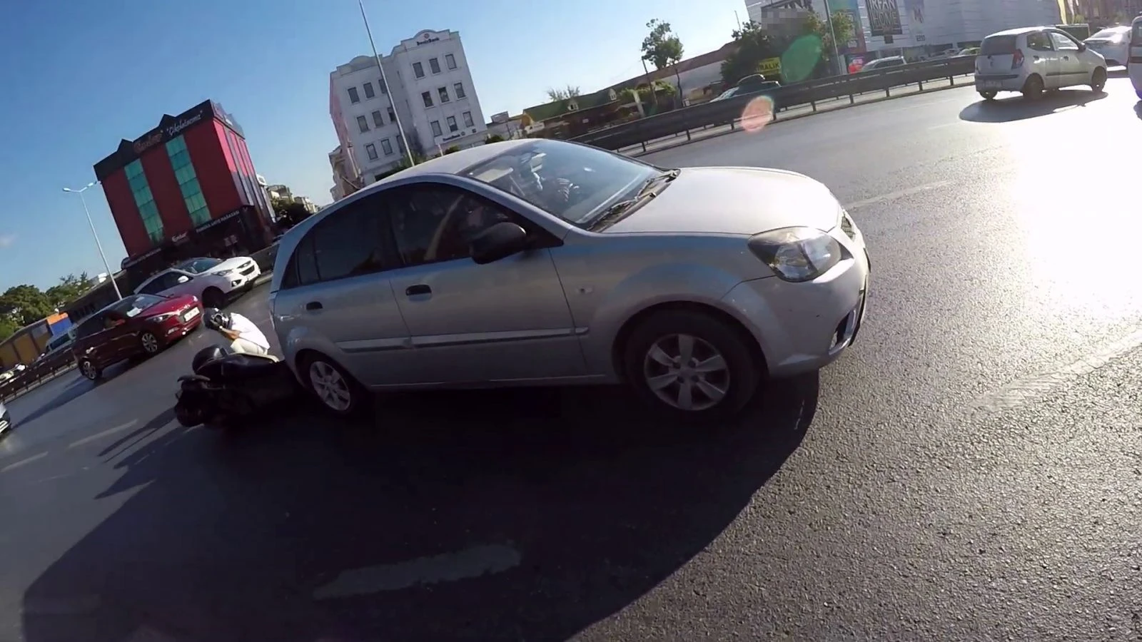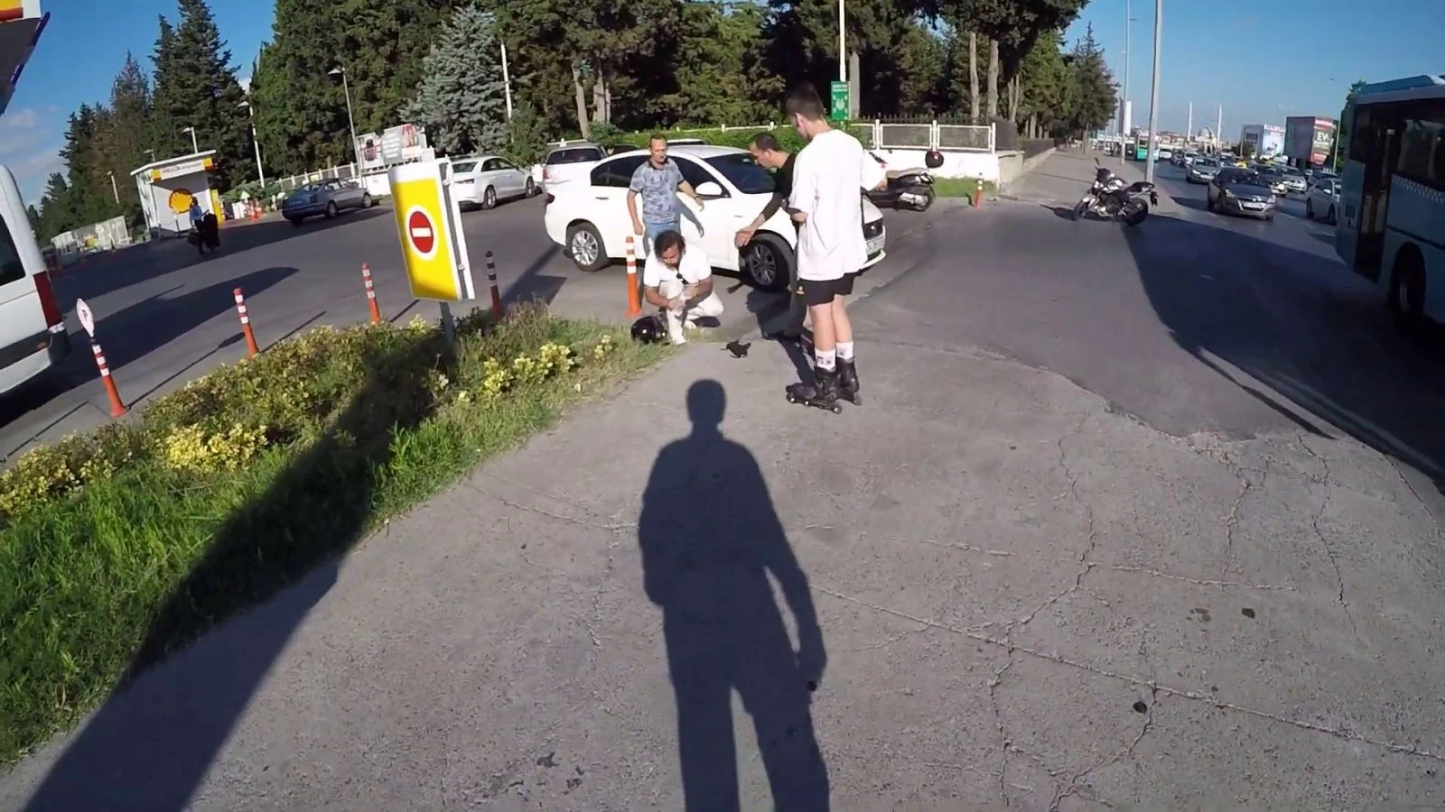 Motosikletiyle beraber yere düşerek birkaç metre sürüklenen genç, yara almadan kurtuldu. Kaza sonrası olayı kask kamerasıyla kaydeden motosiklet sürücü Zafer Y., kaza geçiren sürücünün motosikletini kaldırdı.