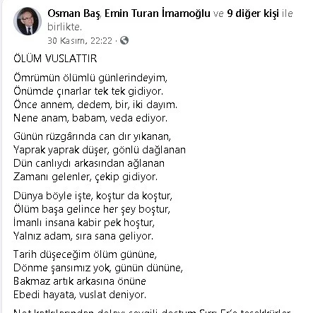 Şair ve yazar olarak tanınan Baş, 30 Kasım’da “Ölüm Vuslattır” başlığında kendi yazdığı dizelerinde şu mısralara yer verdi: