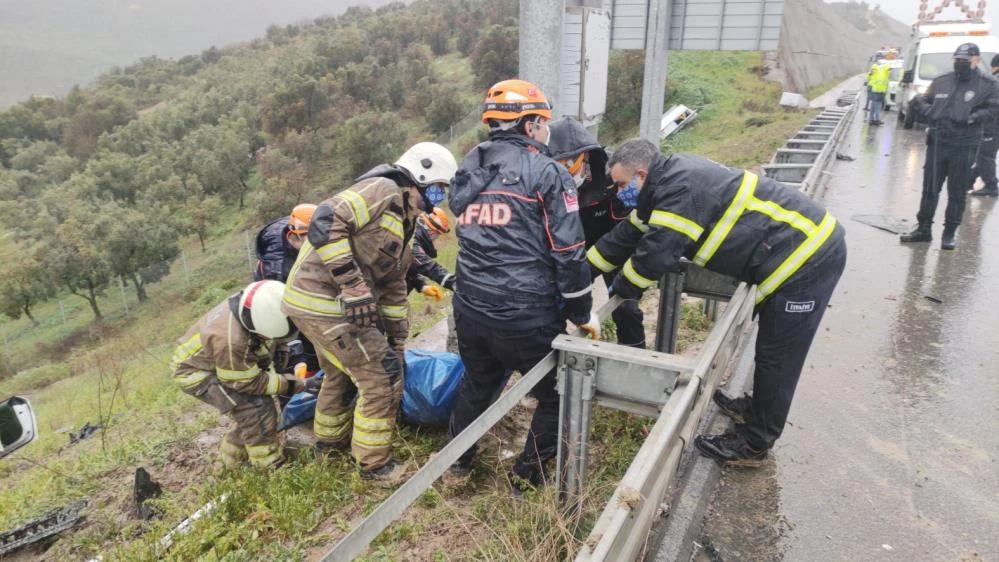 Saat 11.30 sıralarında Gebze-Orhangazi-İzmir Otoyolu, Gemlik Karsak Kavşağı yakınlarında, Mert Ökmen (48) idaresindeki YE67-GXO yabancı plakalı bir otomobil Bursa istikametinden İstanbul istikametine doğru seyir halindeyken aşırı hız ve yolun yağıştan dolayı kaygan olmasından dolayı kontrolden çıktı. Bariyerle çarpan, yol kenarındaki otoyol firmasına ait kontrol kutularını parçalayıp şarampole uçan otomobil hurdaya döndü.