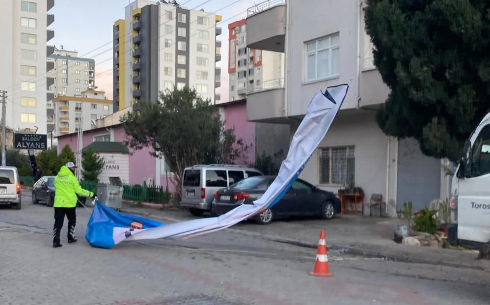 Mersin'in Erdemli ilçesinde rüzgar nedeniyle pankarta bağlı yaklaşık 10 kilogramlık taş bir kadının kafasına düşerek ölümüne neden oldu.
