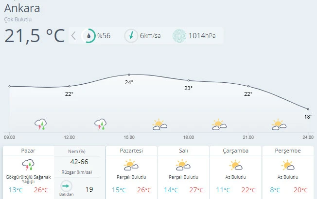 Ankara: Parçalı, zamanla çok bulutlu, öğle saatlerinden sonra il geneli yerel olmak üzere sağanak ve gök gürültülü sağanak yağışlı 26
