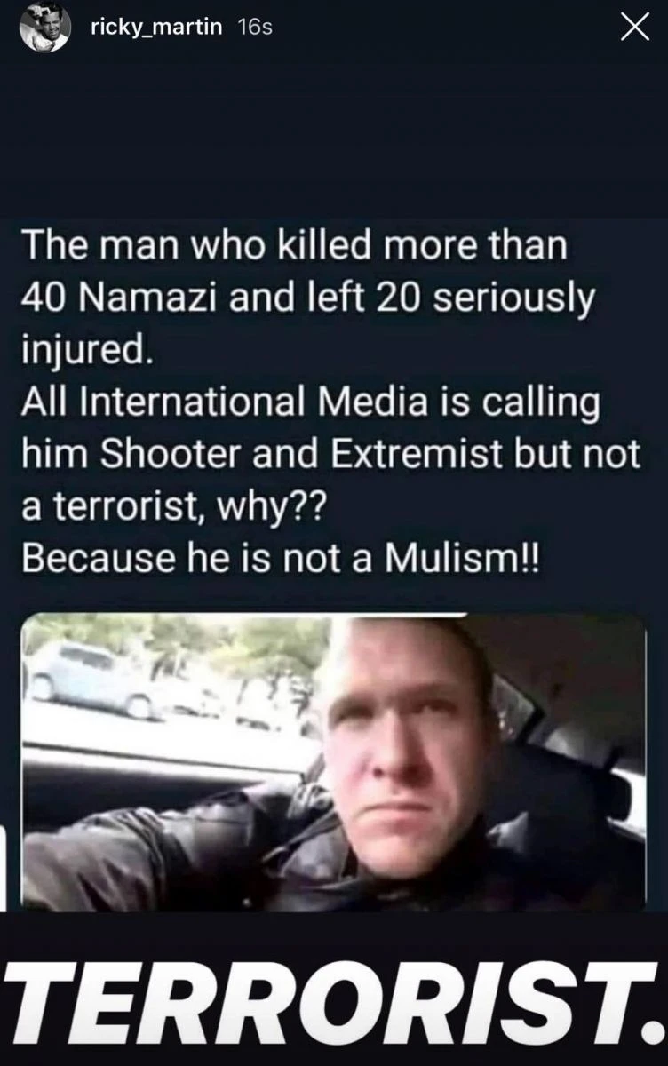 Dünyaca ünlü Porto Rikolu şarkıcı Ricky Martin, Yeni Zelanda saldırısının ardından dünya medyasına tepki gösterdi. Dünyadaki iki yüzlülüğe dikkat çeken Martin, "Bir adam namaz kılan 40’tan fazla insanı öldürüp 20 tanesini de yaraladı. Tüm uluslararası medya onu terörist olarak değil saldırgan ya da radikal olarak nitelendirdi. Neden? Çünkü Müslüman değil" ifadelerini kullandı.