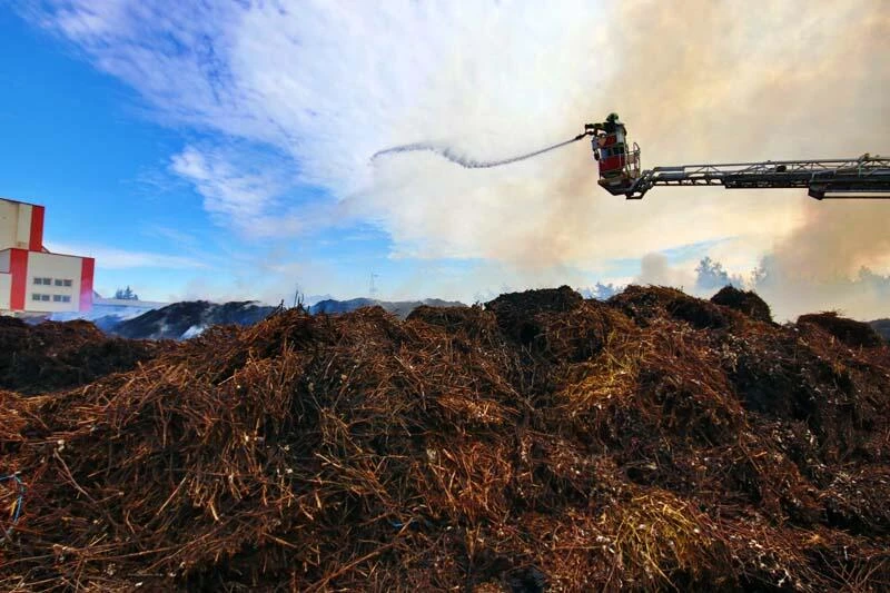 Yanan pamuk sapı balyaları ise içten içe yanmayı önlemek amacıyla kepçeyle küçük parçalar halinde boş bir alana taşınarak söndürülüyor.