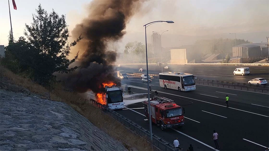 Kayseri'den İstanbul'a yolcu taşıyan Şemsettin Taştan idaresindeki 38 EM 737 plakalı otobüs, Anadolu Otoyolu Gebze gişeleri mevkisinde henüz bilinmeyen sebeple alev aldı.