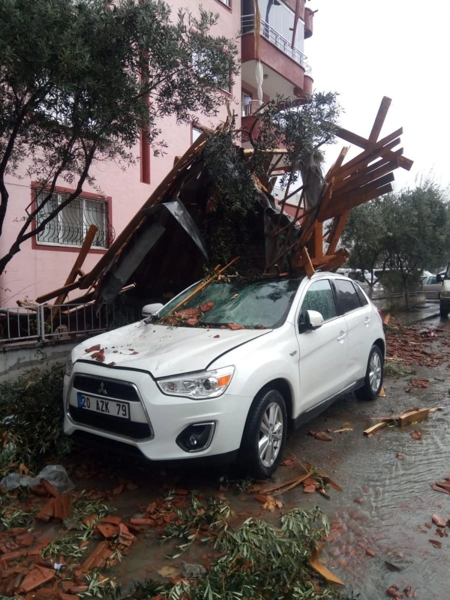 Pamukkale ilçesi Yunus Emre Mahallesi’nde yaşanan olayda, Nail Günenç isimli vatandaş 20 AZK 79 plakalı arazi aracının yanına geldiğinde gözlerine inanamadı. Rüzgardan dolayı uçan bir apartman çatısının aracının üzerine yıkıldığını gören Günenç polisi arayarak yardım istedi.