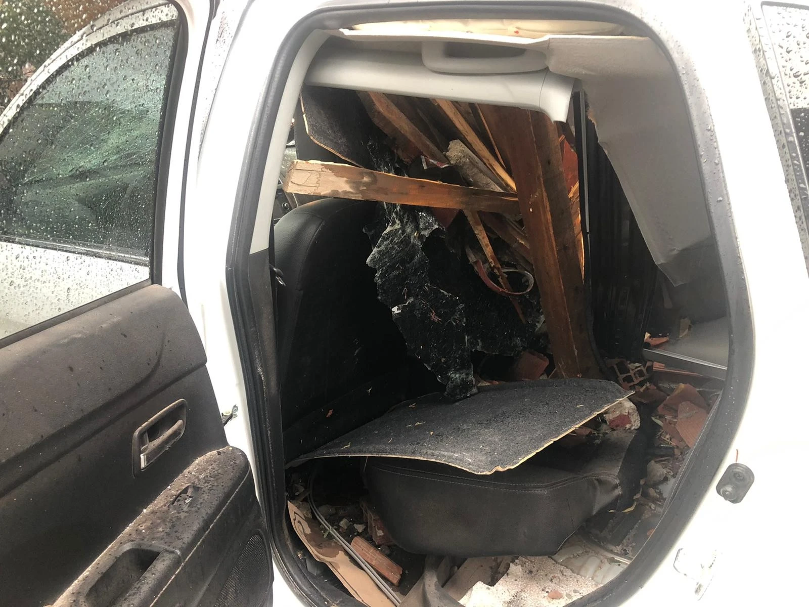 Çatıdan kopan ahşap parçalar aracın tavanından içeri adeta ok gibi saplanırken, olay esnasında yolun ve aracın boş olması faciayı önledi. Araç, tutanak tutulmasının ardından tavanına saplanan malzemelerle çekici yardımıyla kaldırıldı.