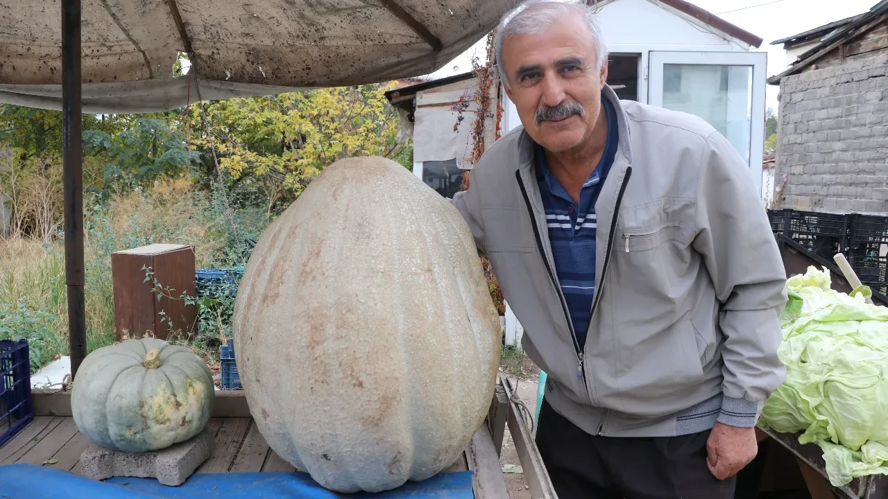 Dev bal kabağını yetiştiren çiftçi Mehmet Önk, "Ben çiftçilikle uğraşıyorum. Bu kabağı amca oğlumla birlikte yetiştirdik. Bunu hazırlarken tarlanın yeri çok önemli. Mayısın ortasında toprağa ekeriz, ekimin ortasında da keser toplarız. Bu kabağın diğerlerinden farklı olma sebebi, tohumunun ata tohumu olması. Tam olarak 51 kilo geliyor. Tarlada hasat edip motora yüklerken iki kişi zor kaldırdık. Tam olarak 51 kilo, kilosunu 25 liraya sattık. Daha önce de böyle büyük ekmiştim ama o 37 kilo gelmişti, böylesine rastlamadık. Bal kabağına sarılmaya çalışınca iki kolum zor kavuşuyor" dedi.