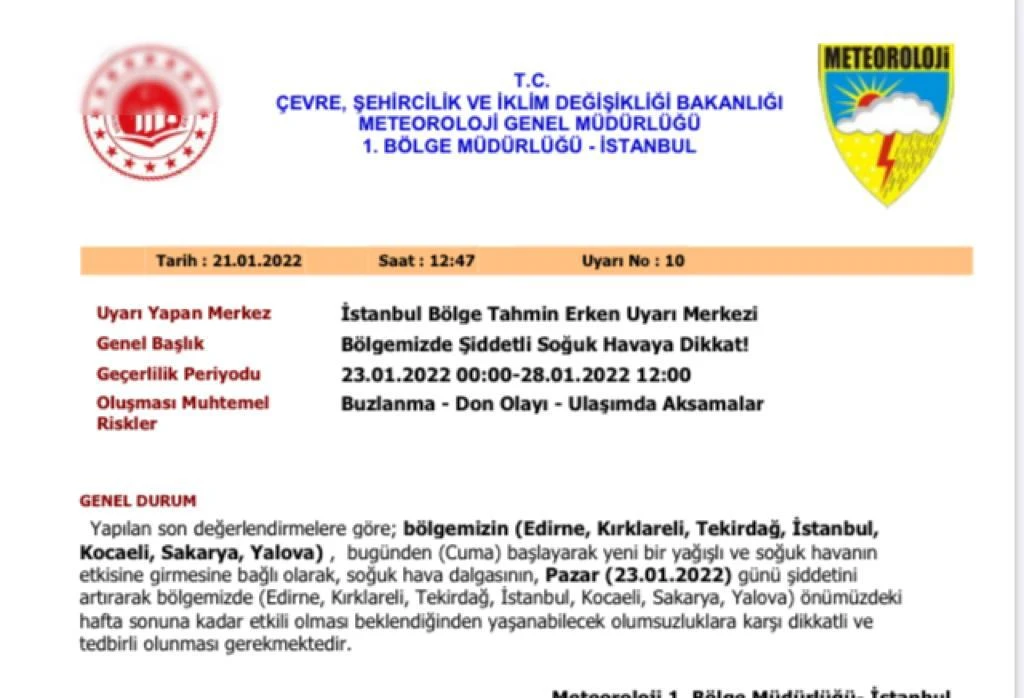 Meteoroloji'den yapılan açıklamada, "Edirne, Kırklareli, Tekirdağ, İstanbul, Kocaeli, Sakarya, Yalova’da bugünden başlayarak yeni bir yağışlı ve soğuk havanın etkisine girmesine bağlı olarak, soğuk hava dalgasının Pazar (23.01.2022) günü şiddetini artırarak, önümüzdeki hafta sonuna kadar etkili olması beklendiğinden yaşanabilecek olumsuzluklara karşı dikkatli ve tedbirli olunması gerekmektedir." ifadelerine yer verildi