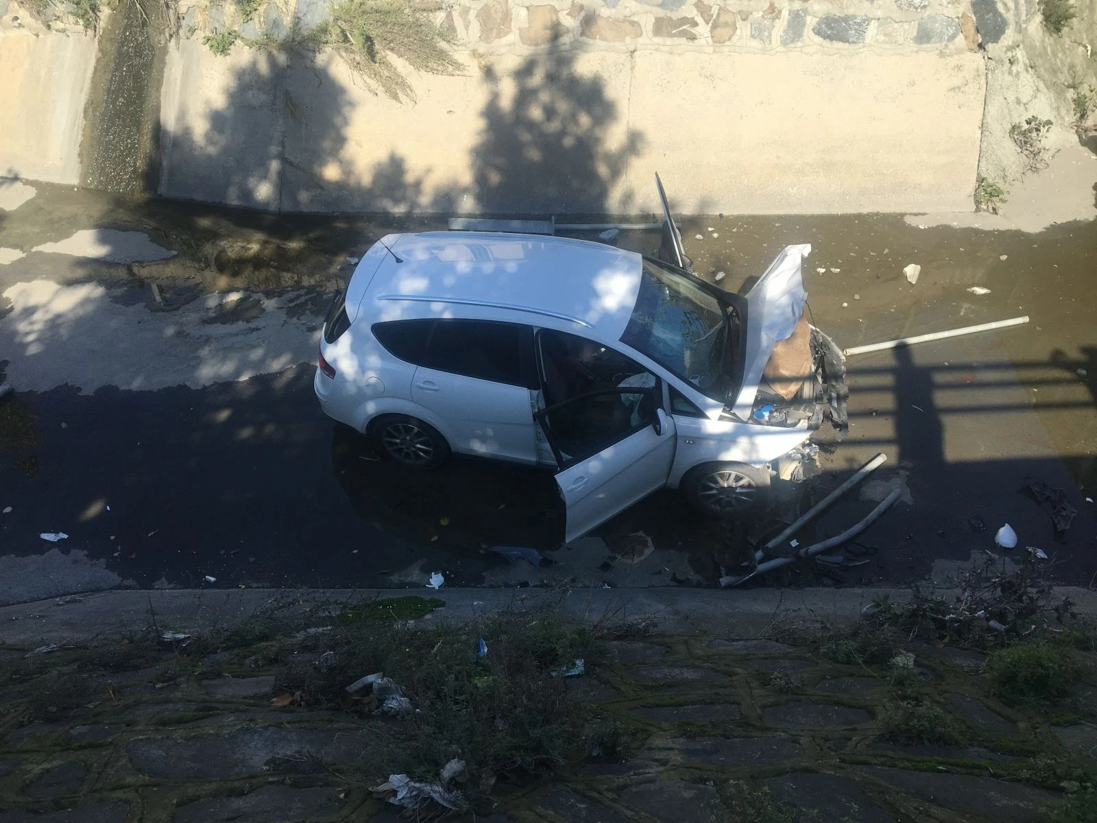 Otomobiliyle bariyerleri aşan Doğan, su kanalını çevreleyen korkulukları da kırarak aşağı uçtu. Şans eseri 4 tekerleğin üstüne düşen araçtan burnu bile kanamadan kurtuldu.