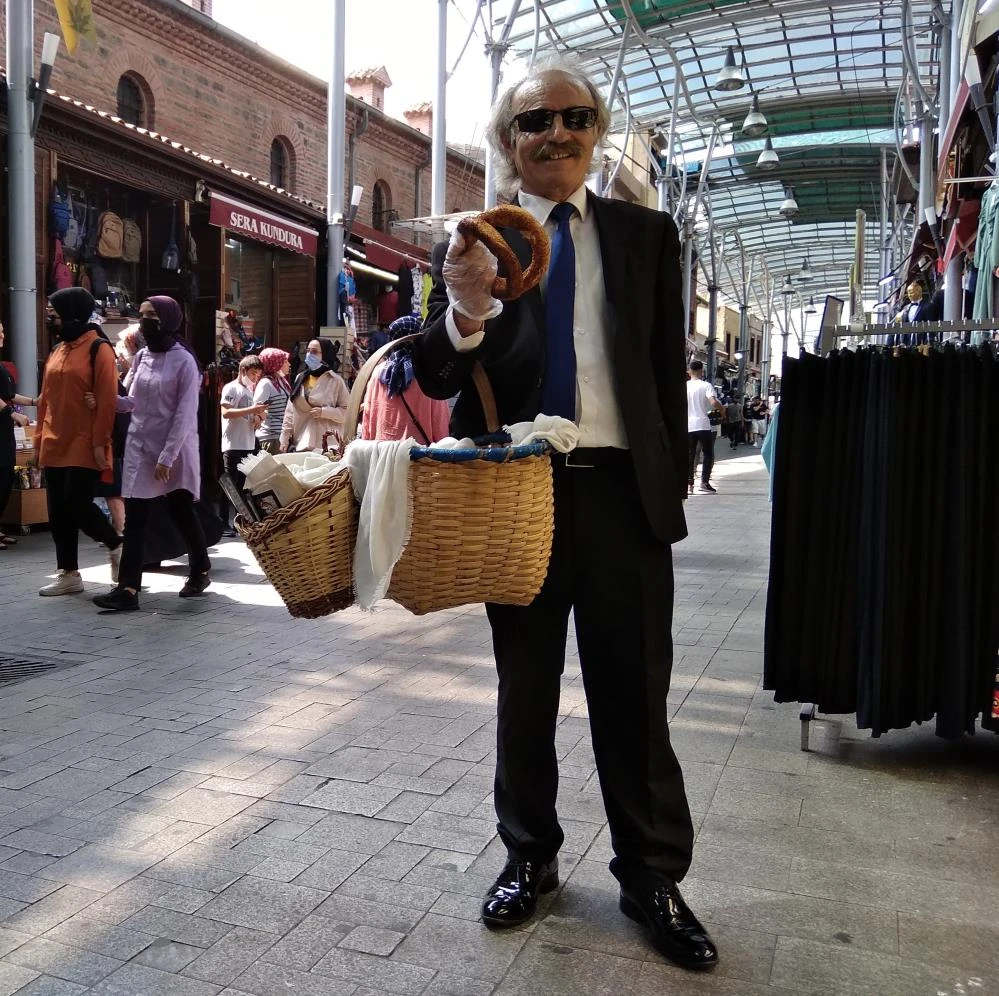 Bursa’da seyyar simit satıcısı olan memur emeklisi Ahmet Berksun, takım elbise ve kravatla çalılıyor. Bu sayede müşterilerinin ilgisini çeken Berksun, taleeplere yetişemiyor.