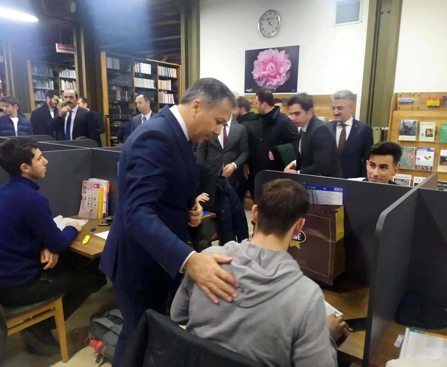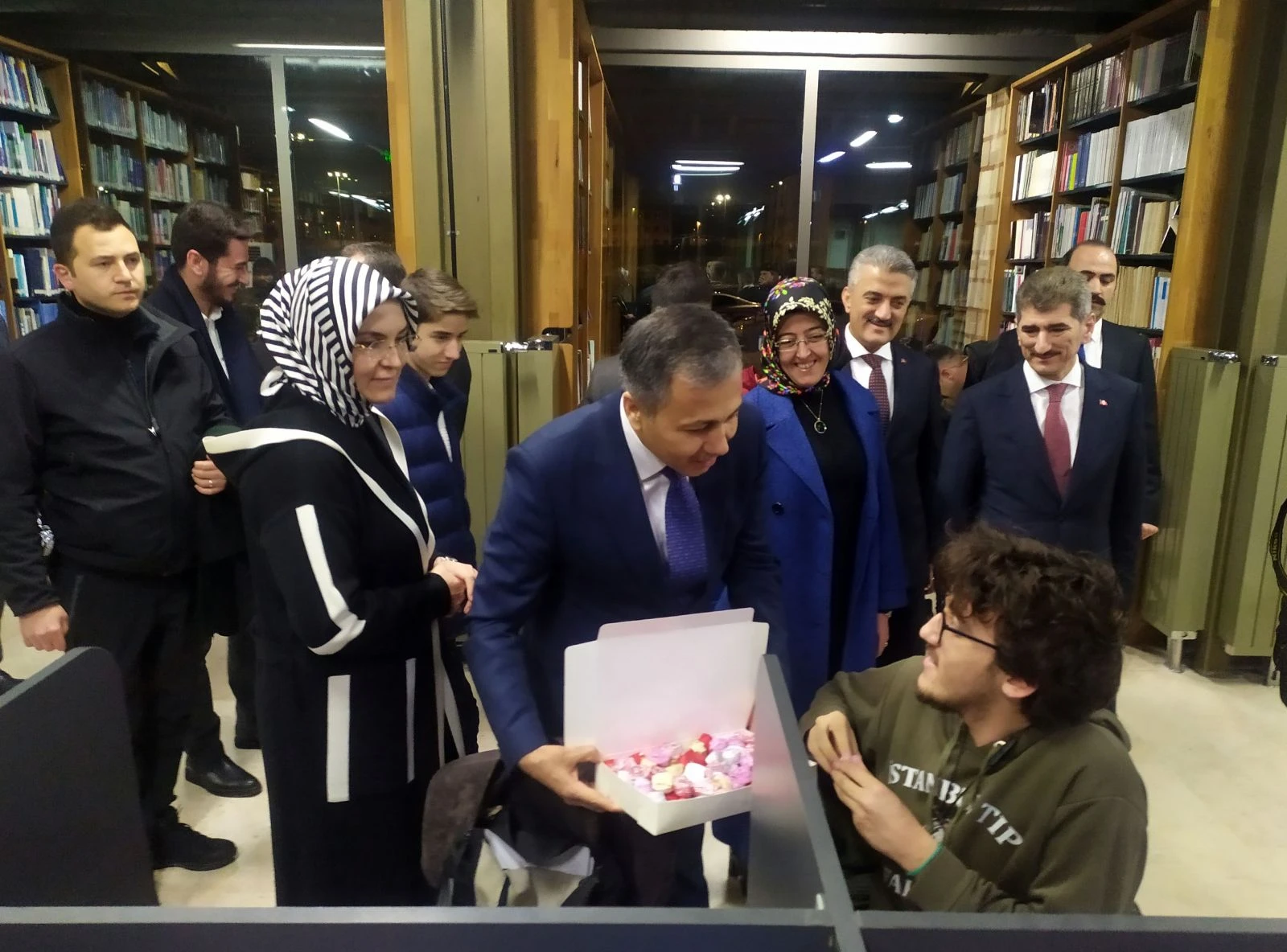 Kütüphanede bulunan ve yeni yıla ders çalışarak giren öğrencilere Vali Yerlikaya çikolata ikramında bulundu.