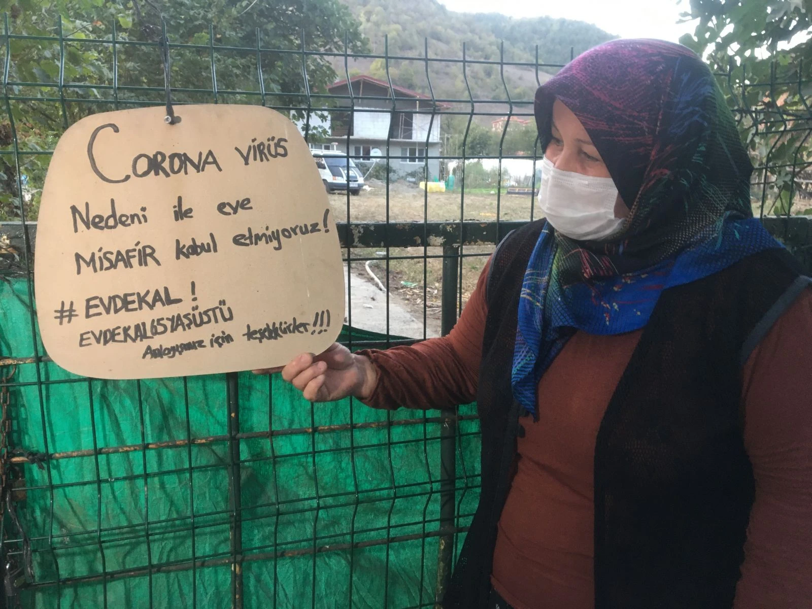 44 yaşındaki anne Fatma Yıldırım yazıyı görenlerin ilk başta şaşırdıklarını belirtirken, “Bunu kızım hastanede yattı yoğun bakımda 10 gün. Geldiğinde kimse gelmesin diye biz tedbir amaçlı milleti kırmamak için böyle yazdık. Ziyaret amaçlı geliniyor hastaneden çıkınca. Kimse de gelmedi sağ olsun. Görenler şaşırıyor yabancıların da ilgisini çekiyor buradan geçenlerin. Bayram arasında da vardı hep. Yani nisan ayından beri var bu yeni asılma değil. Koronanın başladığı ilk zamandan beri hiç kaldırmadık. Korona döneminde akrabalarda olsa yabancıda olsa kimsenin kendine hastalık bulaşmaması açısından, daha doğrusu sağlığı açısından yanaşmaması daha iyi. Çalışanda olsa risk altında. İş yeri de risk altına giriyor. İnsan korkuyor daha doğrusu. Ben tedbirli davranıyorum. Evdekilere de tedbirli davranmaya çalışıyorum. Herkes öyle olsun. Tedbirli davransınlar yine de.” Dedi.