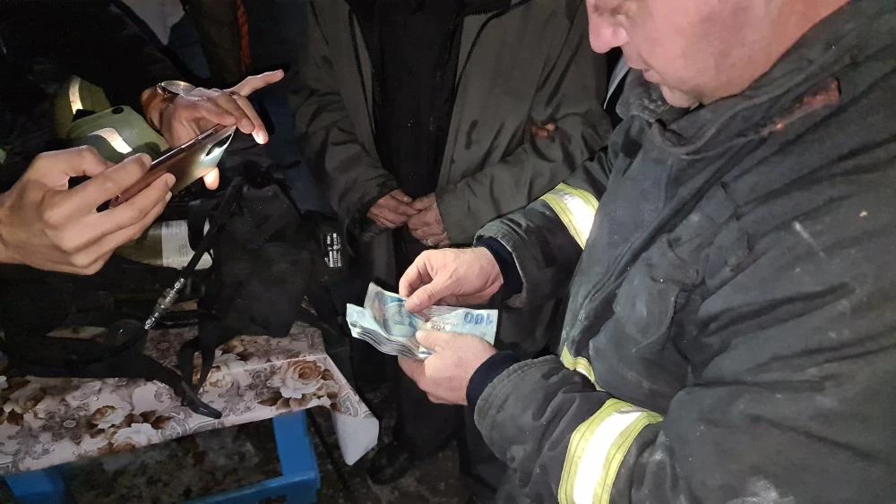 Paltosunun cebinde 2 bin 100 TL parasını bulan itfaiye ekipleri paraları tek tek sayarak Kaynak’a teslim etti.