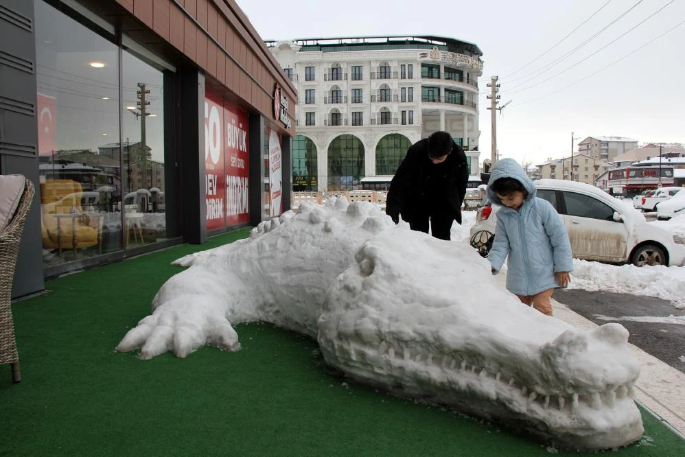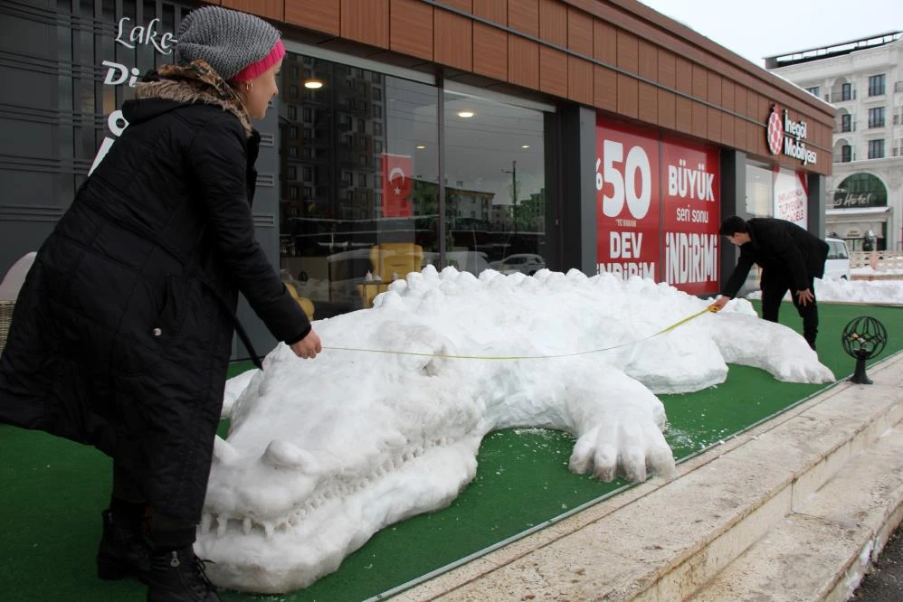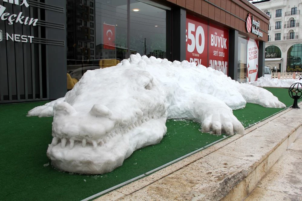 Yaklaşık 11 metre uzunluğundaki kardan timsahın yapımı 6 saat sürdü. İşletmenin önünde dev timsahı görenler şaşkınlıklarını gizleyemedi. Vatandaşlar anı ölümsüzleştirmeyi de unutmadı.