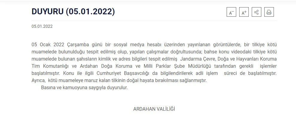 ''Bir sosyal medya hesabı üzerinden yayınlanan görüntülerde, bir tilkiye kötü muamelede bulunulduğu tespit edilmiş olup, yapılan çalışmalar doğrultusunda; bahse konu videodaki tilkiye kötü muamelede bulunan şahısların kimlik ve adres bilgileri tespit edilmiştir. Jandarma Çevre, Doğa ve Hayvanları Koruma Tim Komutanlığı ve Ardahan Doğa Koruma ve Milli Parklar Şube Müdürlüğü tarafından gerekli işlemler başlatılmıştır. Konu ile ilgili Cumhuriyet Başsavcılığı da bilgilendirilerek adli işlem süreci de başlatılmıştır.''