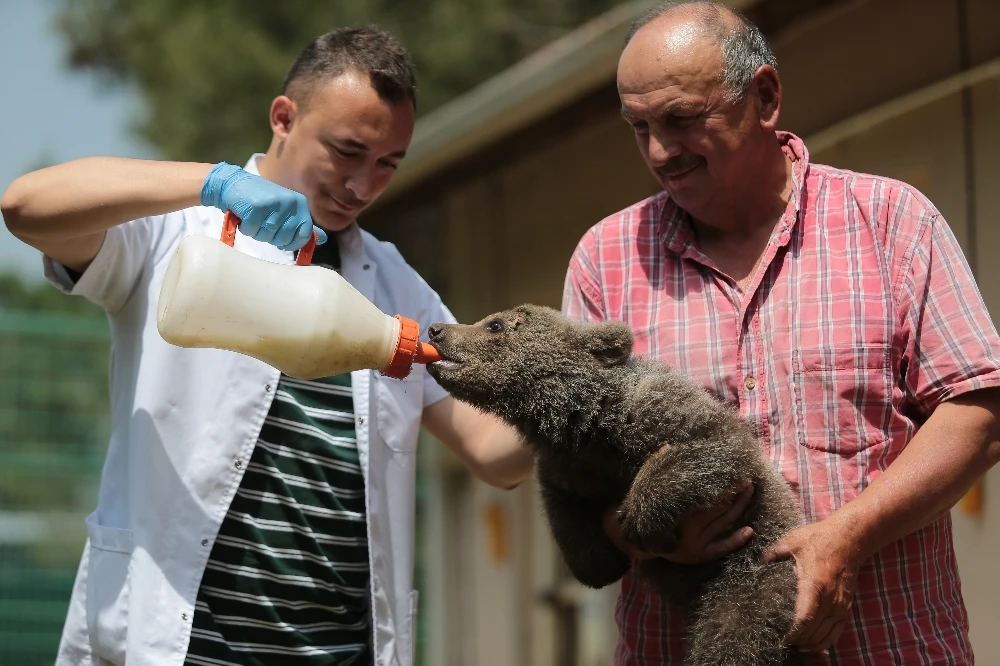 Trabzon’un Çaykara ilçesi Çamlıbel Mahallesi’nde 40 gün önce bir vatandaşın evinin yakınında bulduğu ve sahip çıktığı minik ayı yavrusu Milli Parklar Trabzon Şubesindeki 3 haftalık bakım ve kontrollerinin ardından Bursa Karacabey Ovakorusu Ayı Barınağı’na geçtiğimiz günlerde getirildi. Trabzon’da Yogi, Bursa’da ise Yumoş olarak çağırılan erkek yavru boz ayı, bakıcılarının elinden biberonla özel hazırlanmış sütü her gün büyük bir iştahla içiyor. Sevimli tavırlarıyla barınağın maskotu olan yavru ayının tedavisi ise devam ediyor.