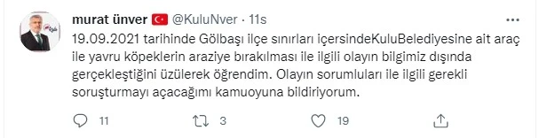 Sosyal paylaşım sitesi Twitter hesabından olayla ilgili açıklama yapan Konya Kulu Belediye Başkanı Murat Ünver, “10.09.2021 tarihinde Gölbaşı ilçe sınırları içerisinde Kulu Belediyesi'ne ait araç ile yavru köpeklerin araziye bırakılması ile ilgili olayın bilgimiz dışında gerçekleştiğini üzülerek öğrendim. Olayın sorumluları ile ilgili gerekli soruşturmayı açacağımı kamuoyuna bildiriyorum” dedi.
