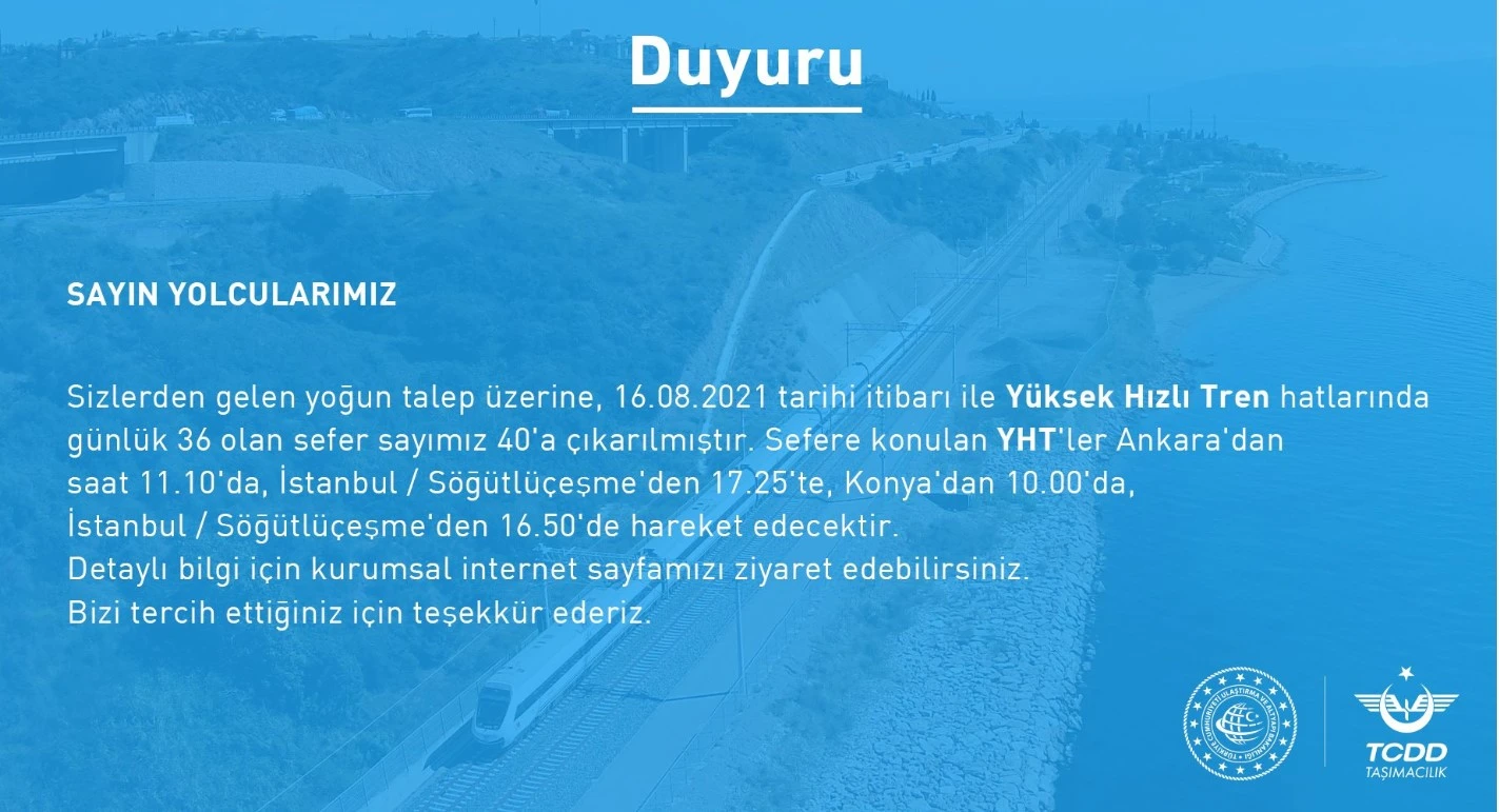 TCDD Taşımacılık A.Ş. Genel Müdürlüğü tarafından, yolcu taleplerini göz önünde bulundurarak Konya-İstanbul, Ankara- İstanbul hatlarındaki YHT sefer sayısını karşılıklı olarak artırıldı. Buna göre sefere konulan YHT’ler; Ankara’dan saat 11.10, İstanbul/ Söğütlüçeşme’den 17.25’de, Konya’dan 10.00’da, İstanbul / Söğütlüçeşme’den 16.50’de hareket edecek.