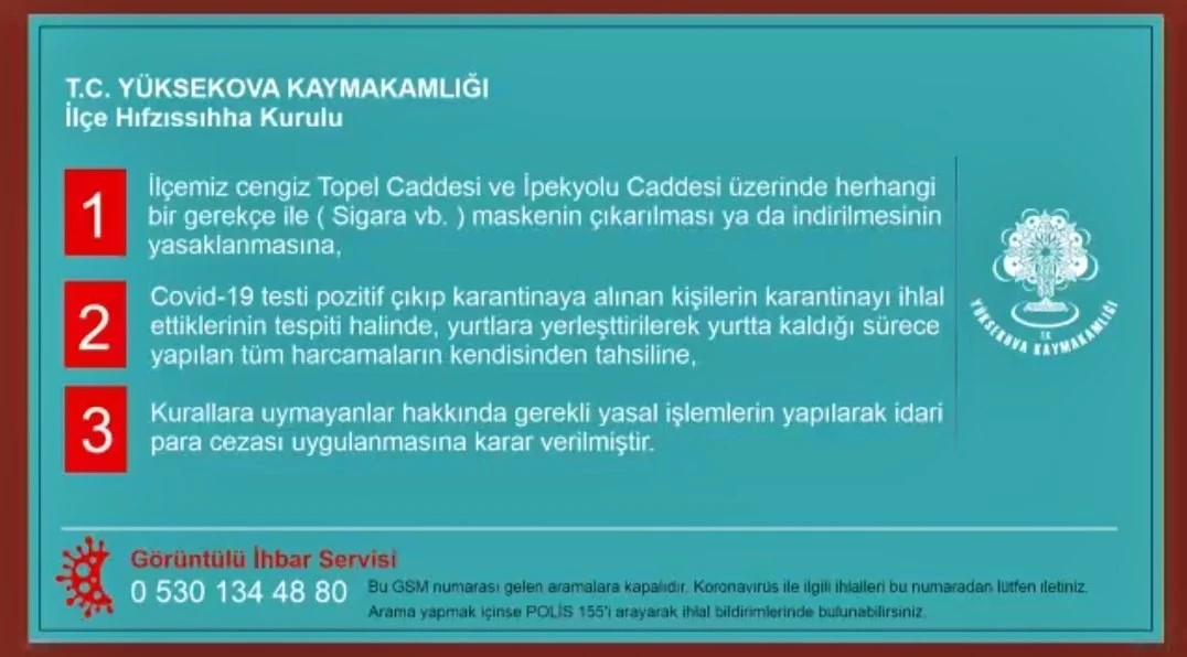 Yüksekova Kaymakamlığından yapılan açıklamada, İlçe Hıfzıssıhha kurulunun aldığı kararla, Topel ve İpekyolu caddeleri üzerinde sigara içmek maksadıyla maske çıkartmak ve karantinayı bozanlarla mücadele edebilmek için 'görüntülü ihbar hattı' açıldığı belirtildi.