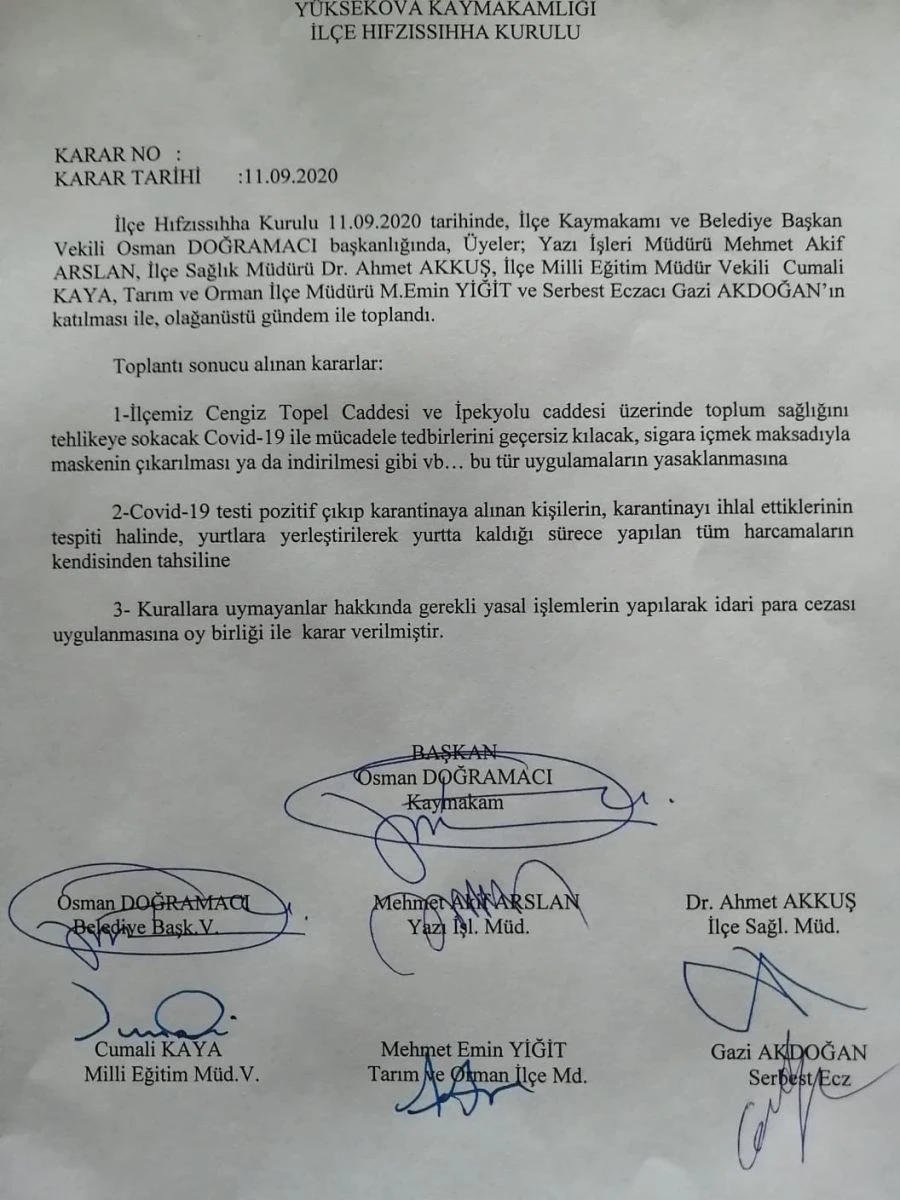 İlçe Hıfzıssıhha kurulunun aldığı kararlar şöyle, “İlçemiz Cengiz Topel ve İpekyolu caddesi üzerinde toplum sağlığını tehlikeye sokacak korona virüs ile mücadele tedbirlerini geçersiz kılacak, sigara içmek maksadıyla maskenin çıkarılması yada indirilmesi gibi bu tür uygulamaların yasaklanmasına. Korona virüs testi pozitif çıkıp karantinaya alınan kişilerin, karantinayı ihlal ettiklerinin tespiti halinde, yurtlara yerleştirilerek yurtta kaldığı sürece yapılan tüm harcamaların kendisinden tahsiline. Kurallara uymayanlar hakkında gerekli yasal işlemlerin yapılarak idari para cezası uygulanmasına oy birliği ile karar verilmiştir." ifadelerine yer verildi.